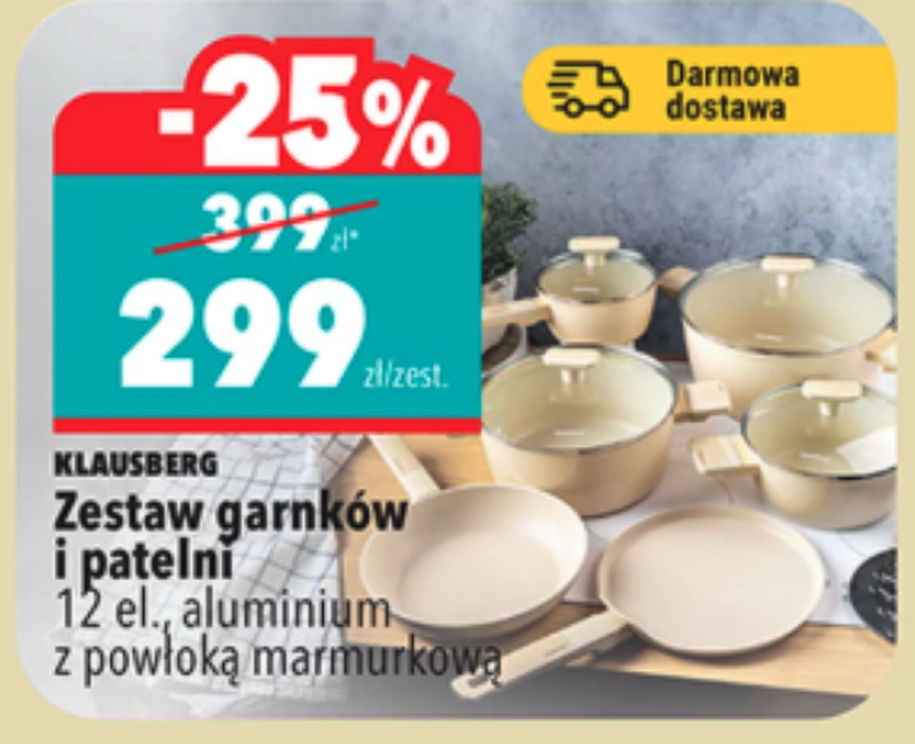 Od 7 kwietnia 2026 Biedronka wprowadza do sprzedaży zestaw garnków Klausberg 12 elementów z powłoką marmurkową w cenie 299 zł — zamiast dotychczasowych 399 zł. To 100 zł oszczędności i promocja, która potrwa aż do 6 maja 2026. Zanim jednak trafi na półki, warto wiedzieć dokładnie, co wchodzi w skład zestawu i czy powłoka marmurkowa to naprawdę wartość dodana, czy tylko ładnie brzmiąca nazwa.