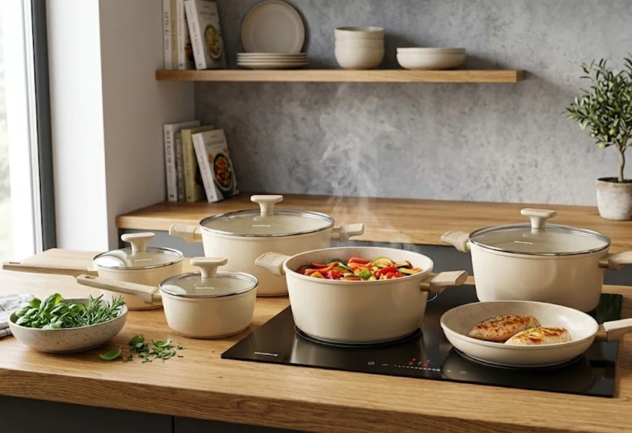 Zacznijmy od konkretu, bo to tu robi się ciekawie. 12 elementów to garnki kilku różnych rozmiarów, patelnia i dopasowane pokrywki — czyli komplet do codziennego gotowania bez zapychaczy. Żadnego miniaturowego garnuszka, który ląduje w szafce i tam zostaje. Liczy się funkcjonalność, i to właśnie ją tu znajdziesz.