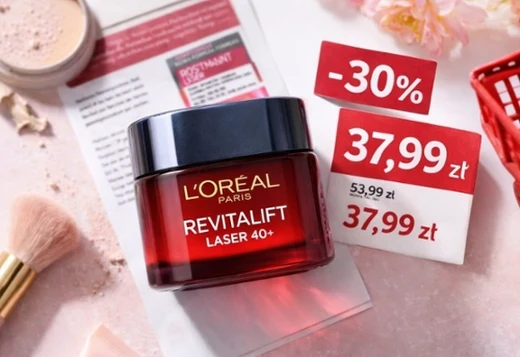 W Rossmannie do 25 lutego 2026 można kupić — sprawdzając aktualną gazetkę Rossmann — krem L'Oréal Paris Revitalift Laser 40+ za 37,99 zł zamiast regularnych 53,99 zł, czyli ponad 16 złotych taniej. Brzmi nieźle, ale zanim wrzucisz go do koszyka, warto sprawdzić, czy ta cena naprawdę robi różnicę na tle tego, co oferuje rynek kremów przeciwzmarszczkowych 40+. Bo czasem „promocja" to tylko lepiej opakowany zwykły cennik.
