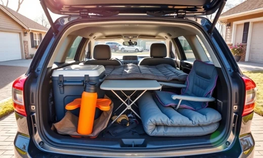 Drobny sprzęt kempingowy — stół, krzesło, materac, latarka