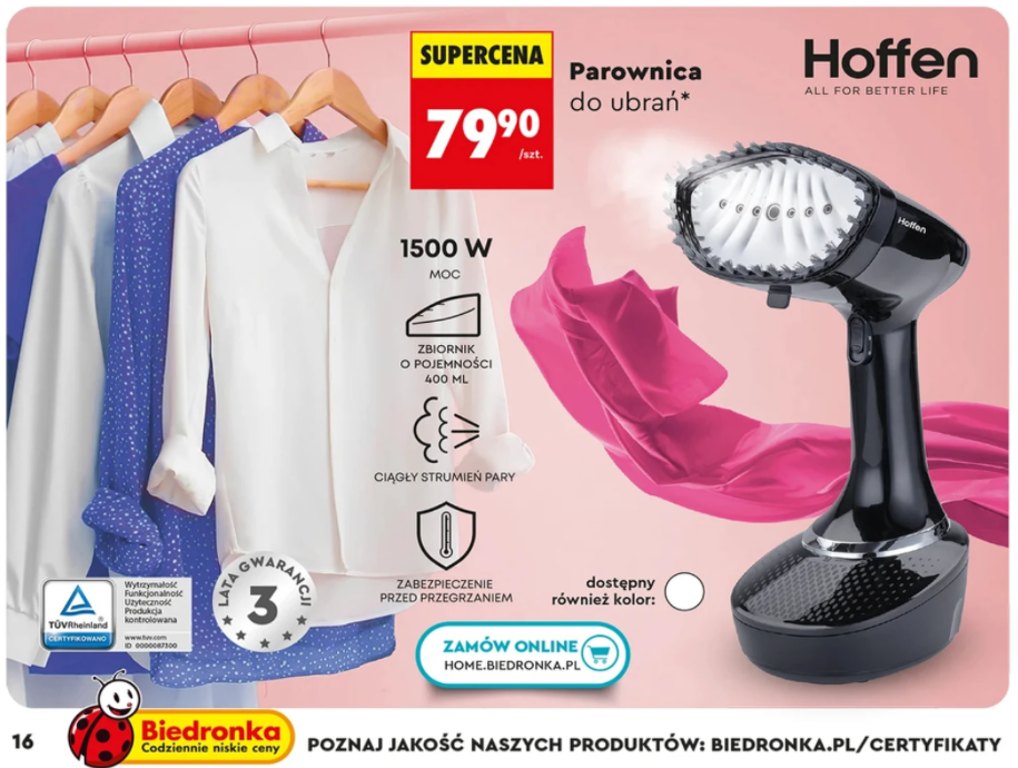 W aktualnej gazetce Biedronki jest parownica o mocy 1500 W i zbiorniku 400 ml za 79,90 zł. Przy takich parametrach i cenie naprawdę nie ma co się długo zastanawiać. To sensowny model dla osoby, która chce spróbować czy para w ogóle jej podejdzie, zanim wyda 300 zł na markę.