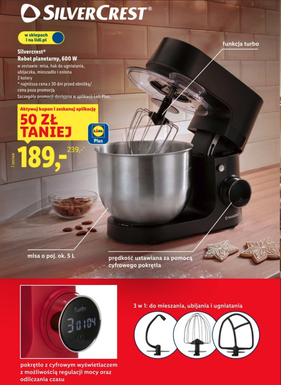 Aby skorzystać z niższej ceny 189 zł, musisz posiadać aplikację Lidl Plus. W aplikacji należy znaleźć i aktywować specjalny kupon na robota planetarnego, a następnie zeskanować swoją kartę Lidl Plus przy kasie. Bez aktywacji kuponu obowiązuje standardowa cena promocyjna 239 zł.