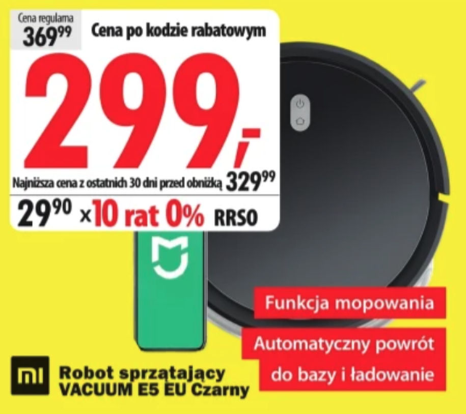 No i tu pojawia się ta oferta. Media Expert wystawił Xiaomi Robot Vacuum E5 za 299 zł — w promocji trwającej do 29 marca. Cena regularna to 369,99 zł, ale z kodem rabatowym spada do właśnie tych 299. Dla porównania: na Mi-Home.pl ten sam model kosztuje 389 zł, a jeszcze niedawno był wyceniony na 449 zł. Szczegóły znajdziesz w aktualnej gazetce promocyjnej Media Expert — oferta obowiązuje do 29 marca.