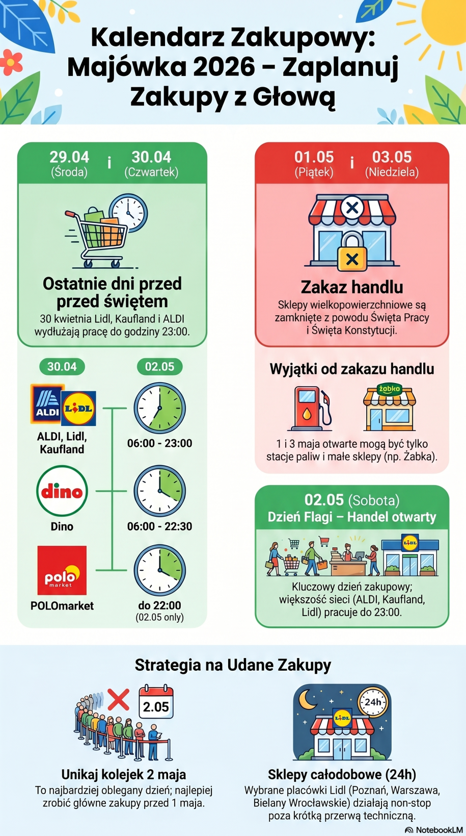 Czy sklepy są otwarte 2 maja? Tak — w sobotę 2 maja 2026 zrobisz zakupy do późnych godzin nocnych. To jeden dzień handlowy wciśnięty między piątek 1 maja a niedzielę 3 maja. Oba święta są dniami z zakazem handlu. Dlatego sobota staje się ratunkiem dla wszystkich, którzy nie zrobili zapasów wcześniej. Większość lidli, biedronek, kauflandów i aldi pracuje wtedy do 23:00. A trzy konkretne lidle w Polsce w ogóle nie zamykają drzwi.