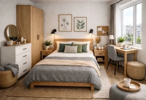 Klasyczny błąd – wstawiasz łóżko drewniane na środek sypialni i nagle nie masz gdzie przejść. W bloku działa jedna zasada: łóżko przy dłuższej ścianie, wezgłowie do ściany. Zostawiasz wtedy minimum 60 cm z każdej strony na przejście.