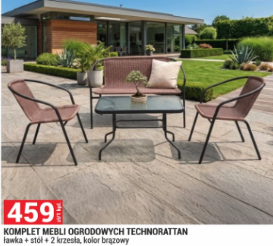 Najtańszy to komplet technorattanowy za 459 zł: ławka, stół i dwa krzesła. Brzmi nieźle, prawda? Ale to plastikowy stelaż, cienkie włókno i poduszki, których pewnie nie ma w zestawie. Do ogrodu rodziców, na działkę, gdzie nie ma co ustawiać drogich mebli — czemu nie. Ale nie oczekuj, że za dekadę będzie wyglądał tak samo.