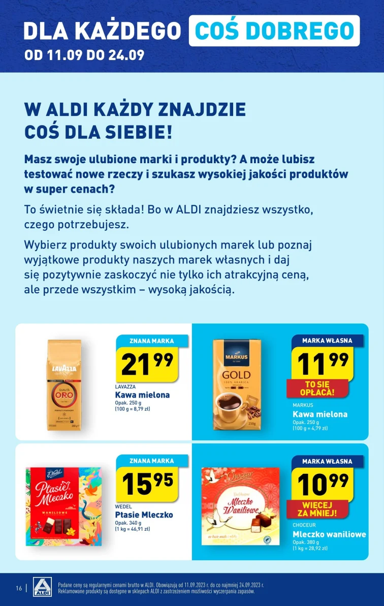Wiesz jakie promocje znajdziesz w Aldi? Zobacz gazetkę promocyjną od 2023-09-11 do 2023-09-16. W niskich cenach dostaniesz: