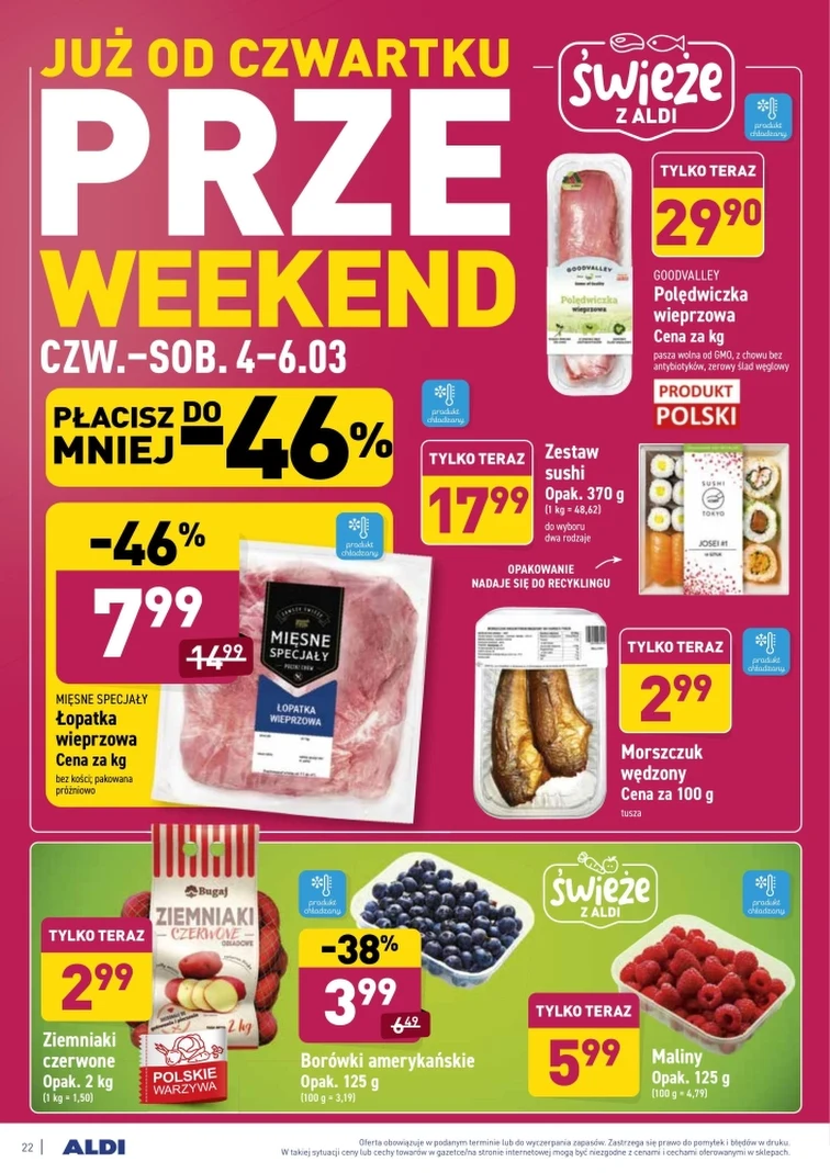 Sprawdź ofertę handlową Aldi, która obowiązuje od 2021-03-01 do 2021-03-08. W gazetce promocyjnej znajdziesz promocje na: