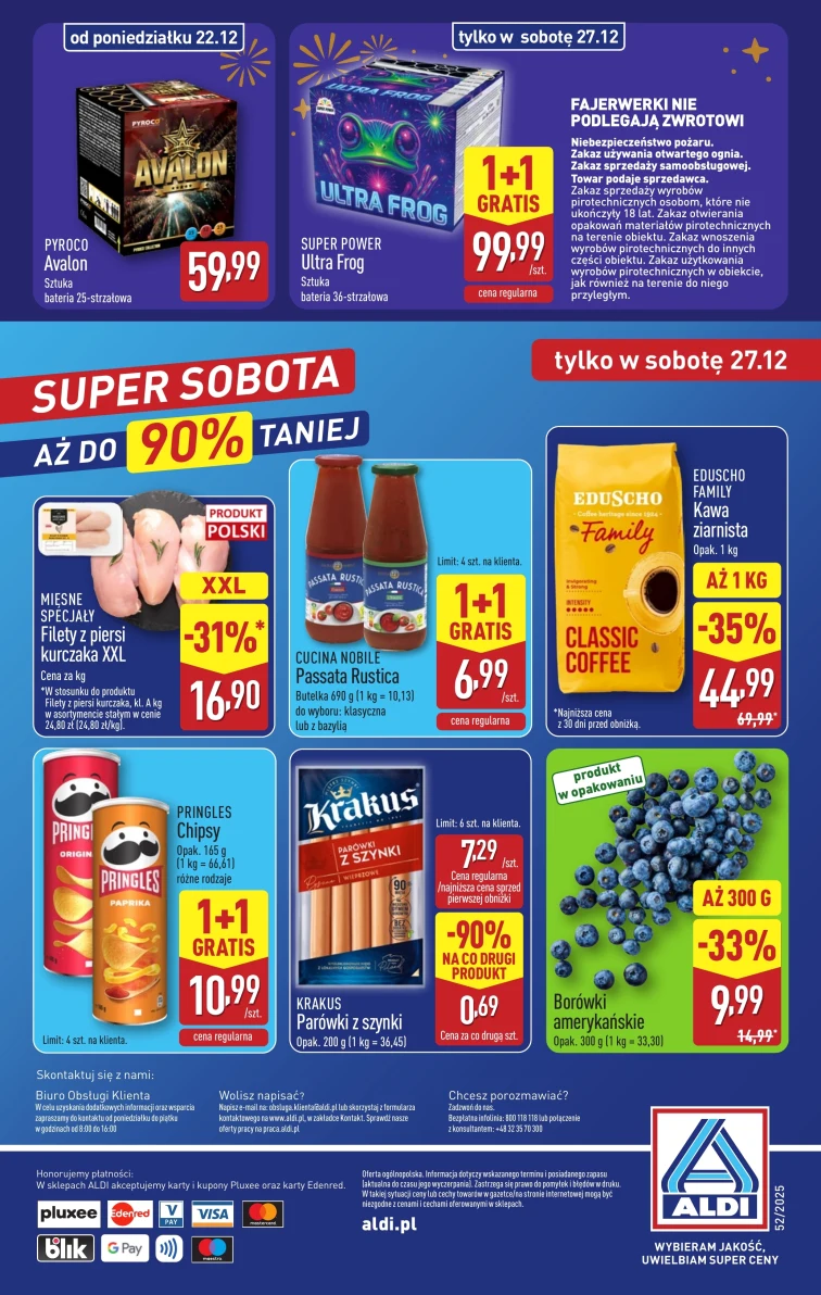 Sprawdź ofertę handlową Aldi, która obowiązuje od 2025-12-22 do 2025-12-27. W gazetce promocyjnej znajdziesz promocje na: