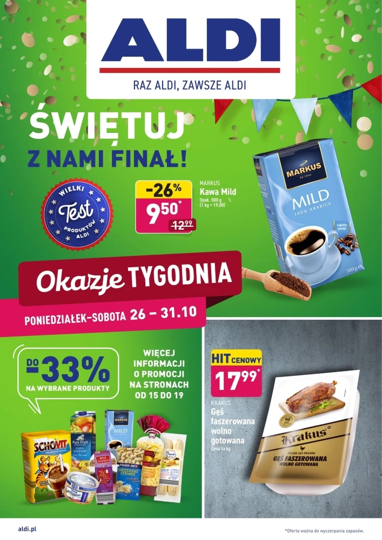 Sprawdź ofertę handlową Aldi, która obowiązuje od 2020-10-26 do 2020-10-31. W gazetce promocyjnej znajdziesz promocje na: