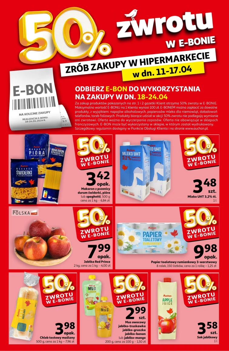 Nie przegap promocji w Auchan Hipermarket. Wspaniałe rabaty obejrzysz w gazetce promocyjnej od 2024-04-11 do 2024-04-17. Warto przyjrzeć się tym produktom: