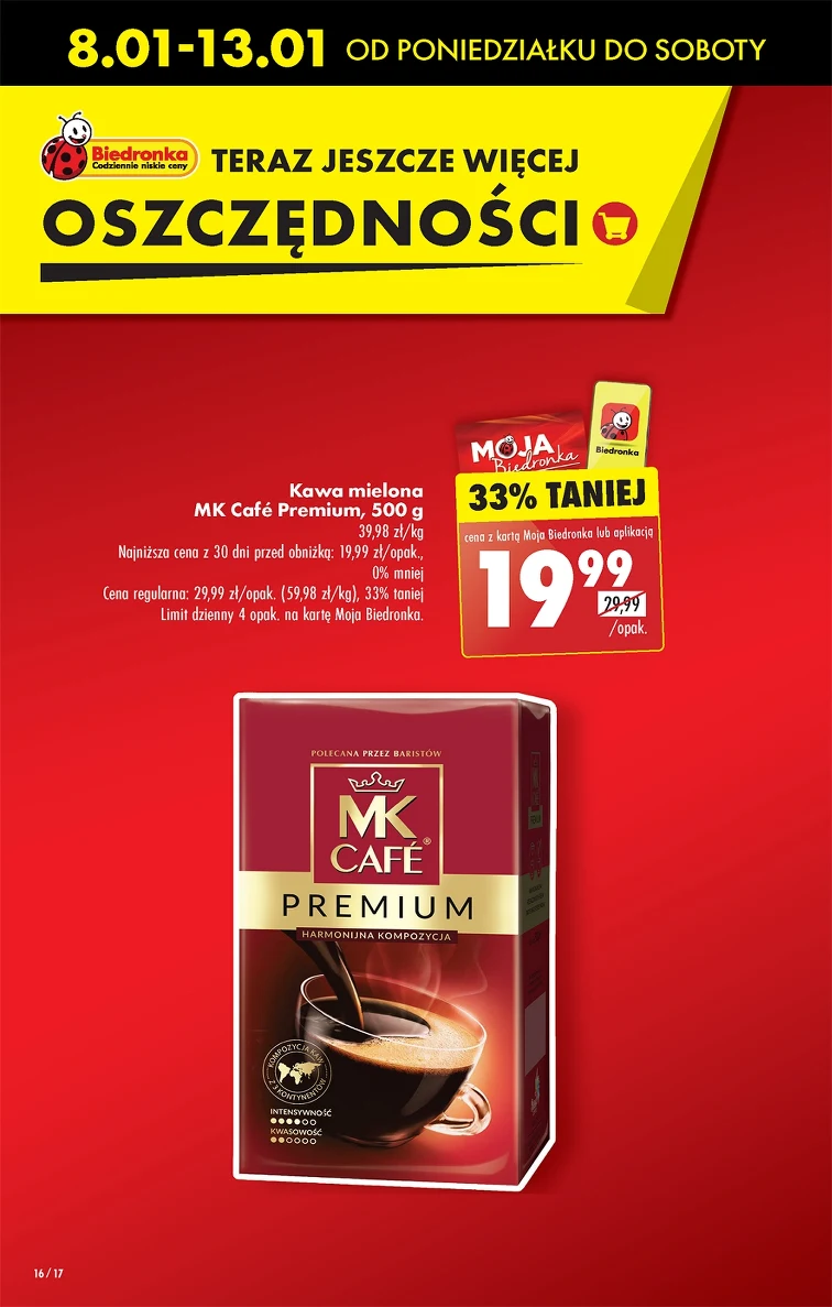 Sprawdź ofertę handlową Biedronka, która obowiązuje od 2024-01-11 do 2024-01-17. W gazetce promocyjnej znajdziesz promocje na: