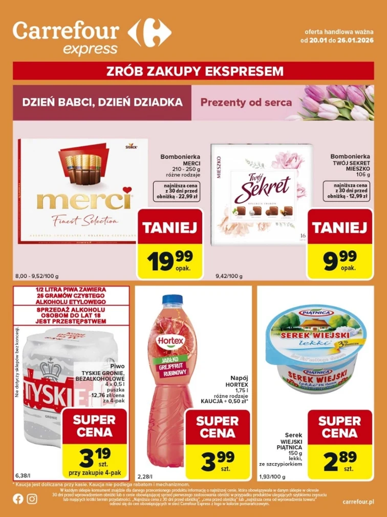 Kupując w Carrefour Express oszczędzasz! Zobacz aktualną ofertę w gazetce promocyjnej od 2026-01-20 do 2026-01-26. W niskich cenach kupisz: