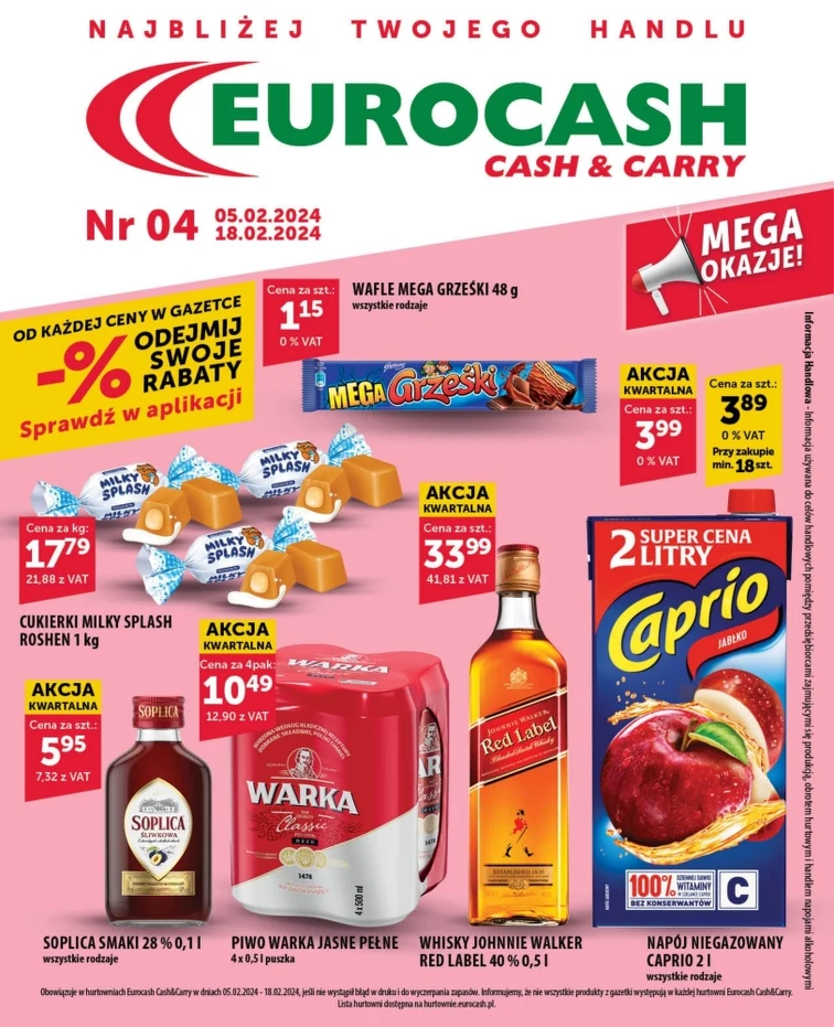 Zobacz promocję w Eurocash Cash&Carry. W gazetce promocyjnej od 2024-02-05 do 2024-02-18 są świetne rabaty! Sprawdź jak tanio dostaniesz: