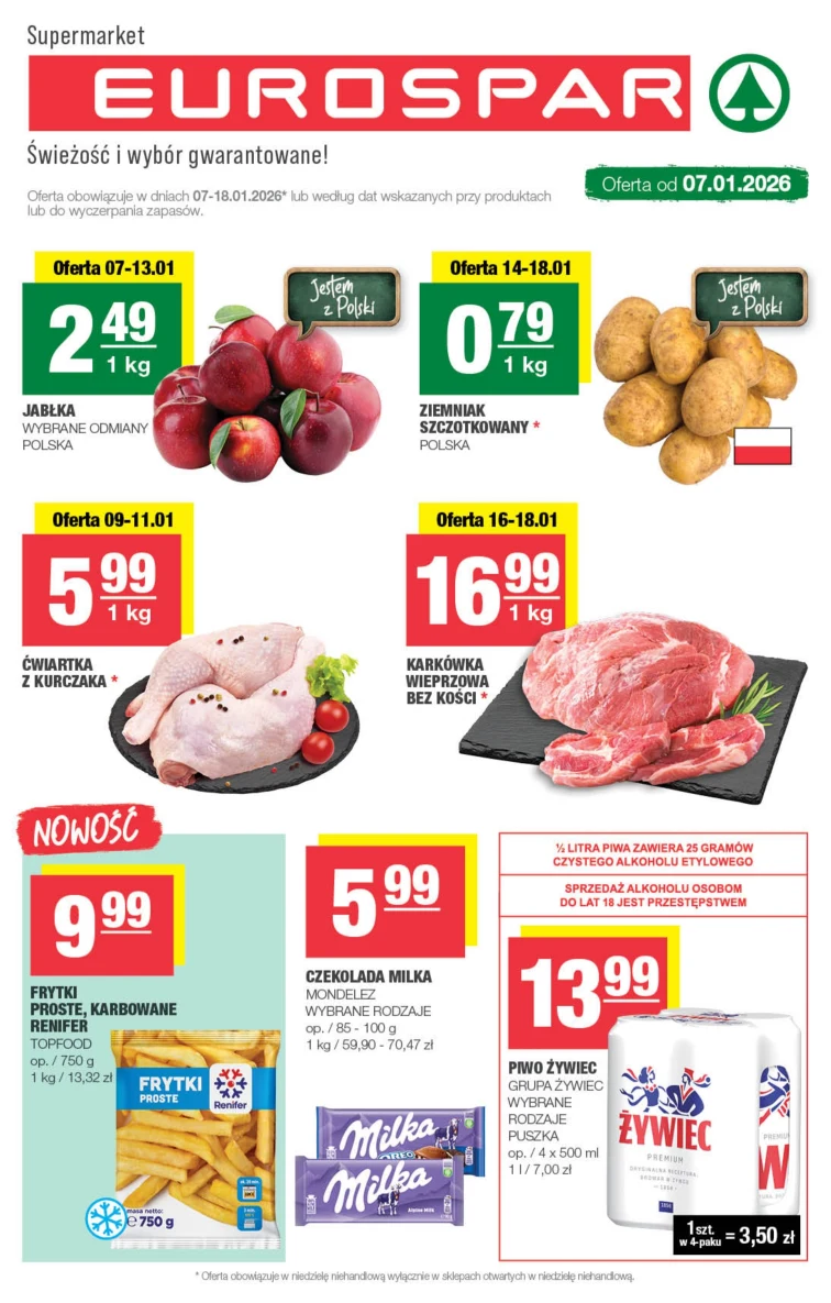 Sprawdź gazetkę EuroSPAR! Promocje w sklepach sieci są ważne od 2026-01-07 do 2026-01-18. W atrakcyjnej cenie dostaniesz takie produkty: