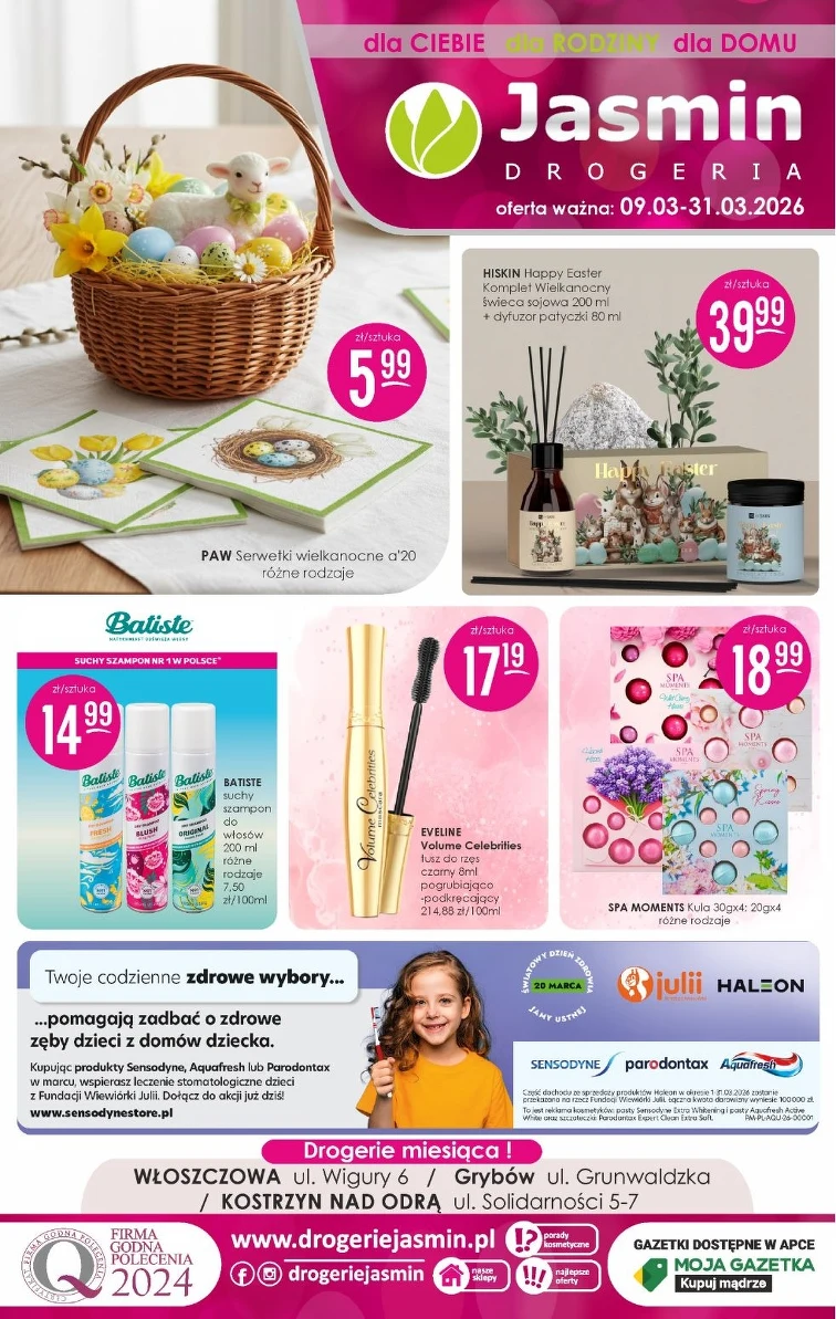 Promocje w sklepach Jasmin Drogerie obowiązują od 2026-03-09 do 2026-03-31. Sprawdź gazetkę promocyjną Jasmin Drogerie i upoluj najlepsze promocje na: