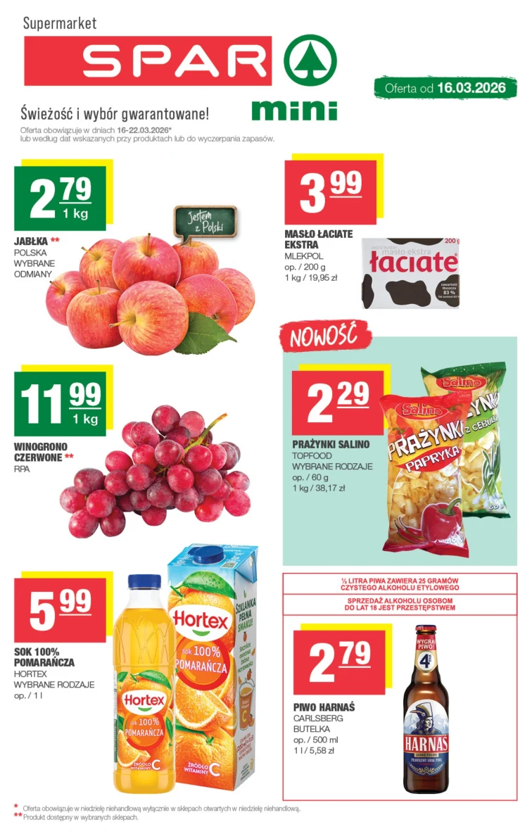 Rabaty w gazetce promocyjnej SPAR mini. Promocja obowiązuje od 2026-03-16 do 2026-03-22. W atrakcyjnej cenie dostaniesz: