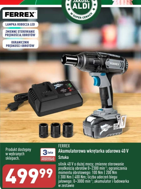 FERREX Akumulatorowa wkrętarka udarowa 40 V Sztuka silnik 40 V o dużej mocy; zmienne sterowanie prędkością obrotów 0-2300 min-¹; ograniczenia momentu obrotowego: 100 Nm | 200 Nm | 300 Nm | 400 Nm; liczba uderzeń biegu jałowego: 0-3000 min¹; akumulator i ładowarka w zestawie