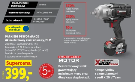 Akumulatorowy klucz udarowy PARKSIDE PERFORMANCE jest dostępny w ofercie Lidl w cenie 399,-. To wydajne narzędzie z bezszczotkowym silnikiem BRUSHLESS, przeznaczone do wymagających prac warsztatowych i motoryzacyjnych. W zestawie znajdziesz akumulator, ładowarkę, trzy klucze nasadowe oraz praktyczną walizkę do przechowywania, a także złączkę ułatwiającą pracę. Klucz udarowy oferuje trzy poziomy momentu obrotowego i wyróżnia się ponadprzeciętną mocą – zwalniającą aż o 370% i dokręcania o 230% w porównaniu do modelu PARKSIDE PASSK 20-Li B2, a także dziesięciokrotnie dłuższym czasem eksploatacji silnika. Dodatkowo, jest kompatybilny z akumulatorami z serii X 20 V Team, co czyni go jeszcze bardziej uniwersalnym. Oferta ważna od 2026-04-20 do 2026-04-26 Źródło: gazetka Lidl