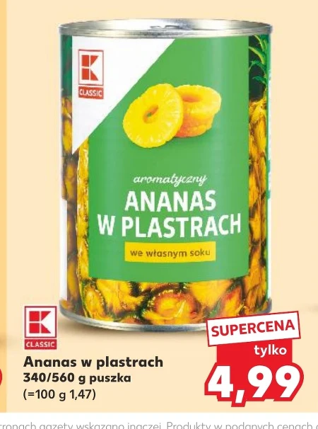 Ananas w plastrach 340/560 g puszka (=100 g 1,47) nach gazety wskazano inaczej Pr Plastry ananasa w puszce to doskonały składnik do przygotowywania przekąsek i deserów, nadający im egzotyczny smak i soczystość. Można je wykorzystać jako dodatek do sałatek owocowych, koktajli, a także do wypieków, wzbogacając każdy posiłek o witaminy i błonnik.