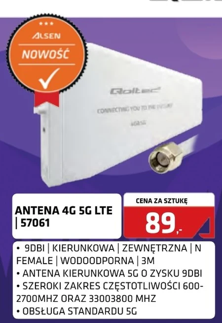 ANTENA 4G 5G LTE 57061· 9DBI | KIERUNKOWA | ZEWNĘTRZNA | N FEMALE | WODOODPORNA | 3M · ANTENA KIERUNKOWA 5G O ZYSKU 9DBI · SZEROKI ZAKRES CZĘSTOTLIWOŚCI 600- 2700MHZ ORAZ 33003800 MHZ · OBSŁUGA STANDARDU 5G