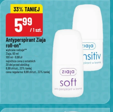Antyperspirant Ziaja roll-on* wybrane rodzaje ** Ziaja, 60 ml 100 ml - 9,98 zł najniższa cena z ostatnich 30 dni przed obniżką: 8,99 zł/szt., 33% taniej cena regularna: 8,99 zł/szt., 33% taniej