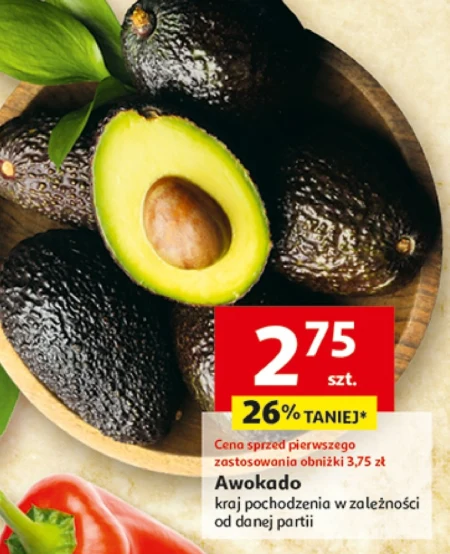 Awokado dostępne w Auchan kosztuje teraz 2,75 zł za sztukę, co oznacza obniżkę o 26% względem ceny sprzed promocji wynoszącej 3,75 zł. Ten kremowy owoc idealnie nadaje się do przygotowania guacamole, sałatek, past kanapkowych lub jako dodatek do dań kuchni meksykańskiej. Pochodzenie awokado różni się w zależności od dostawy, zapewniając świeżość produktu. Nie przegap okazji, by zaopatrzyć się w to zdrowe i smaczne awokado w atrakcyjnej cenie.