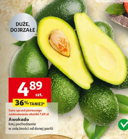 Awokado dostępne jest w ofercie Auchan w cenie 4,89 za sztukę, co stanowi 36% taniej w porównaniu do ceny sprzed obniżki wynoszącej 7,69 zł. To kremowe i pożywne owoce, idealne do przygotowania guacamole, sałatek, kanapek lub jako dodatek do dań głównych. Pochodzenie awokado jest zróżnicowane, w zależności od aktualnej partii. Warto skorzystać z tej okazji i zaopatrzyć się w świeże awokado w atrakcyjnej cenie. Oferta ważna od 2026-04-23 do 2026-04-28 Źródło: gazetka Auchan
