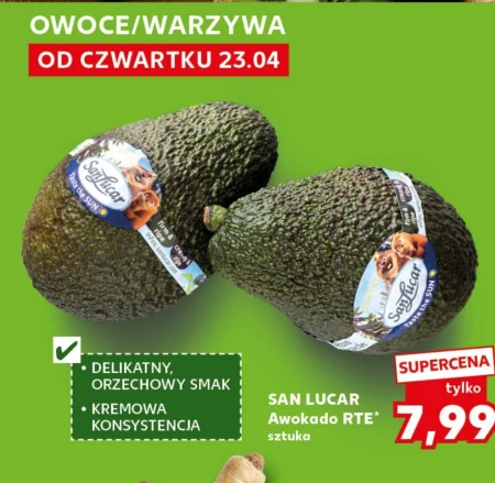Awokado RTE marki SAN LUCAR dostępne jest w ofercie Kaufland w cenie 7,99 za sztukę. Charakteryzuje się delikatnym, orzechowym smakiem i kremową konsystencją, idealnie nadaje się do kanapek, sałatek czy jako dodatek do dań głównych. To doskonały wybór dla tych, którzy cenią sobie świeżość i wygodę, ponieważ jest gotowe do spożycia. Warto skorzystać z tej okazji, aby za niewielkie pieniądze cieszyć się smakiem zdrowego i wartościowego owocu. Źródło: gazetka Kaufland