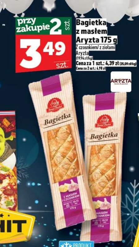 Bagietka z masłem Aryzta 175 g Z czosnkiem/ z ziołami Aryzta (19,94zł/kg) Cenaza 1 szt .: 4,39 zł (25,09 zł/kg) Cena za 2 szt .: 6,98 zł