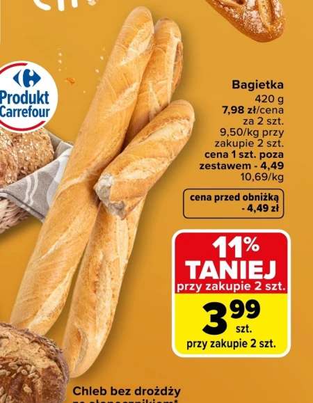 Bagietka Carrefour dostępna w zestawie dwóch sztuk za 7,98 zł, co daje cenę 3,99 zł za pojedynczą bagietkę. Przy zakupie dwóch bagietek, kilogram produktu kosztuje 9,50 zł, a cena jest niższa o 11% w porównaniu do ceny regularnej 4,49 zł za sztukę. Bagietki o wadze 420 g idealnie sprawdzą się jako dodatek do śniadania lub bazy do kanapek.