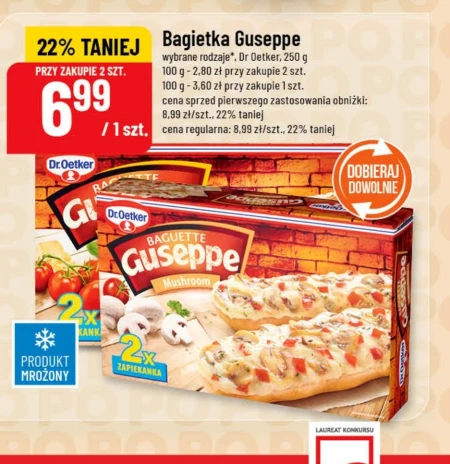 Bagietka Guseppe wybrane rodzaje*, Dr Oetker, 250 g 100 g - 2,80 zł przy zakupie 2 szt. 100 g - 3,60 zł przy zakupie 1 szt. cena sprzed pierwszego zastosowania obniżki: 8,99 zł/szt., 22% taniej cena regularna: 8,99 zł/szt., 22% taniej