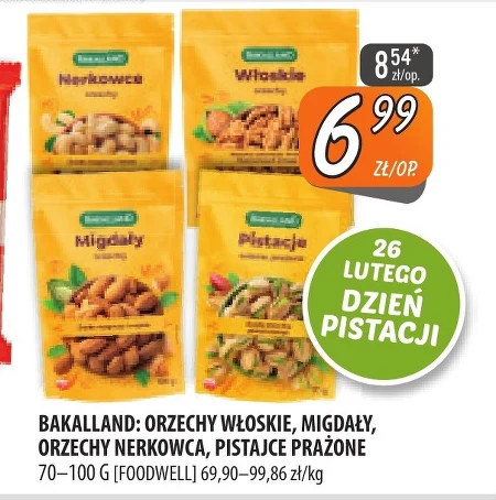 BAKALLAND: ORZECHY WŁOSKIE, MIGDAŁY, ORZECHY NERKOWCA, PISTAJCE PRAŻONE 70-100 G [FOODWELL] 69,90-99,86 zł/kg