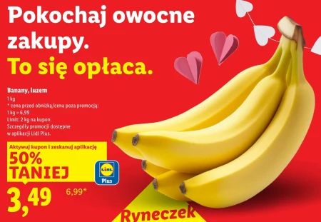 Banany, luzem 1 kg * cena przed obniżką/cena poza promocją: 1 kg = 6,99 Limit: 2 kg na kupon. Szczegóły promocji dostępne w aplikacji Lidl Plus.