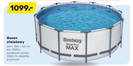 Basen stelażowy, wymiary: 366 x 122 cm. Pojemność 10250 l. Wydajność pompy: 2006 l/h, drabinka, przykrycie.