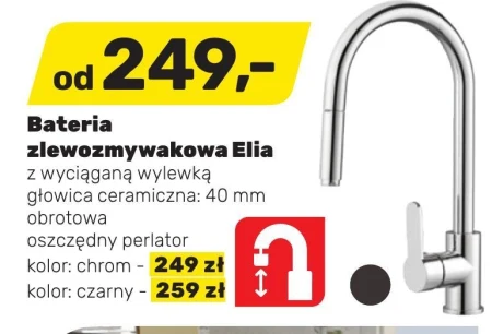 Bateria zlewozmywakowa Elia, z wyciągana wylewką głowica ceramiczna : 40 mm obrotowa, oszczędny perlator kolor : chrom - 249 zł kolor : czarny - 259 zł.