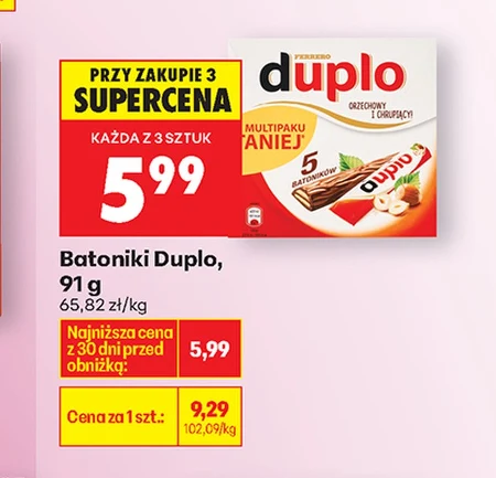 Batoniki Duplo, 91 g 65,82 zł/kg Delikatne batoniki Duplo to idealna słodka przekąska, która zaspokoi ochotę na coś słodkiego w każdej chwili. Doskonałe do zjedzenia na szybko, świetnie sprawdzą się również jako dodatek do kawy lub deseru, nadając mu wyjątkowego smaku i tekstury.