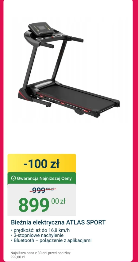 Bieżnia elektryczna ATLAS SPORT · prędkość: aż do 16,8 km/h · 3-stopniowe nachylenie · Bluetooth - połączenie z aplikacjami Najniższa cena z 30 dni przed obniżką: 999,00 zł