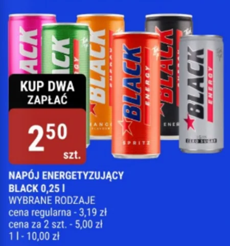 NAPÓJ ENERGETYZUJĄCY BLACK 0,25 l WYBRANE RODZAJE cena regularna - 3,19 zł cena za 2 szt. - 5,00 zł 1 l - 10,00 zł