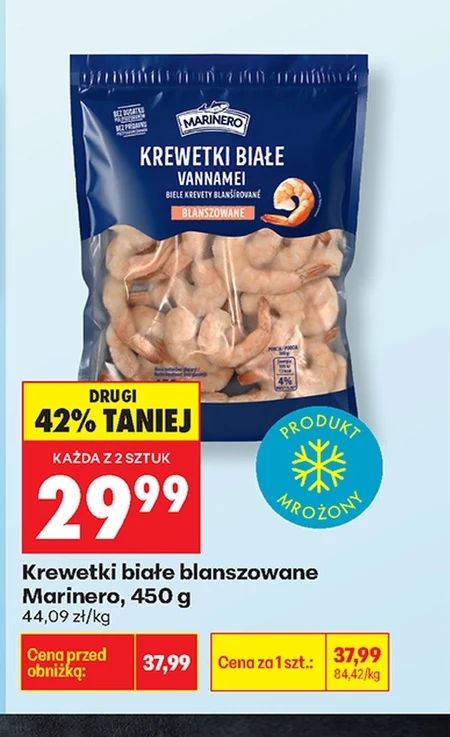 Krewetki białe blanszowane Marinero dostępne są w Biedronce w cenie 29,99 zł za opakowanie o wadze 450 g, co daje 44,09 zł za kilogram. Aktualnie obowiązuje promocja „Każda z 2 sztuk”, dzięki której można je nabyć z rabatem aż 42% względem ceny regularnej 37,99 zł. Produkt jest mrożony i idealnie nadaje się do przygotowania szybkiej kolacji, sałatek lub dań kuchni azjatyckiej. Warto skorzystać z tej okazji, ponieważ to świetna cena za wysokiej jakości krewetki.