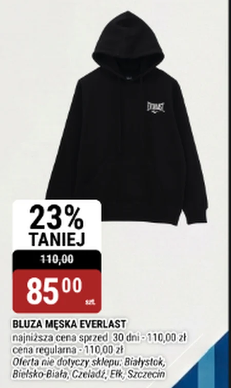 BLUZA MĘSKA EVERLAST najniższa cena sprzed 30 dni - 110,00 zł cena regularna - 110,00 zł Oferta nie dotyczy sklepu: Białystok, Bielsko-Biała, Czeladź, Eik, Szczecin
