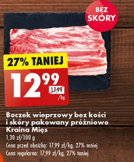 próżniowo Boczek wieprzowy bez kości i skóry pakowany Kraina Mięs 1,30 zł/100 g Cena przed obniżką: 17,99 zł/kg, 27% mniej Cena regularna: 17,99 zł/kg, 27% taniej