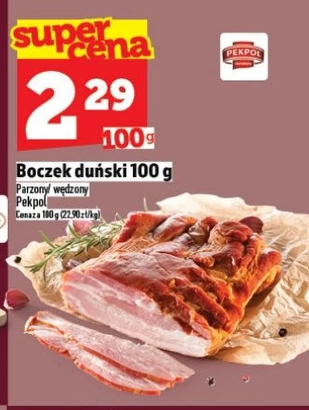 Boczek duński 100 g Parzony/ wędzony Pekpol Cenaza 100 g (22.90zł/kg)