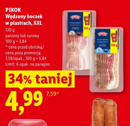 PIKOK Wędzony boczek w plastrach, XXL 130 g parzony lub surowy 100 g = 3,84 * cena przed obniżką/ cena poza promocją: 7,59/opak., 100 g = 5,84 Limit: 6 opak. na paragon.