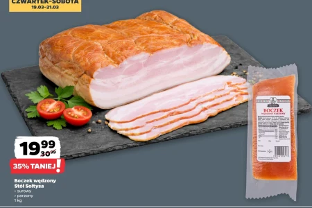 Boczek wędzony Stół Sołtysa > surowy > parzony 1 kg 19,99 30,99 35% TANIEJ! Wędzony boczek dostępny w Netto w dwóch wariantach – surowym i parzonym, idealny do kanapek, zup lub jako dodatek do dań głównych. Aktualnie w promocyjnej cenie 19,99 zł za kilogram (boczek surowy) lub 30,99 zł za kilogram (boczek parzony), co stanowi 35% zniżki. To doskonała okazja, by zaopatrzyć się w ten popularny składnik i wzbogacić smak codziennych posiłków.