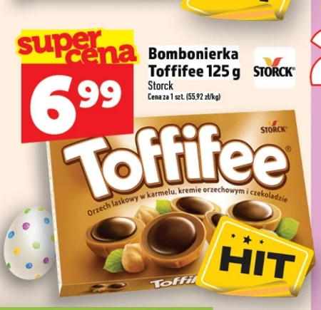 Bombonierka Toffifee Storck dostępna jest w Topaz w cenie 6,99 zł za opakowanie o gramaturze 125 g, co daje 55,92 zł za kilogram. To idealny słodki upominek lub przekąska na co dzień, szczególnie dla miłośników połączenia nugatu, karmelu i orzecha laskowego. Czekoladki są pakowane pojedynczo, dzięki czemu są wygodne w przechowywaniu i idealne do dzielenia się z bliskimi. Skorzystaj z tej okazji i zaopatrz się w swoją ulubioną bombonierkę w atrakcyjnej cenie.