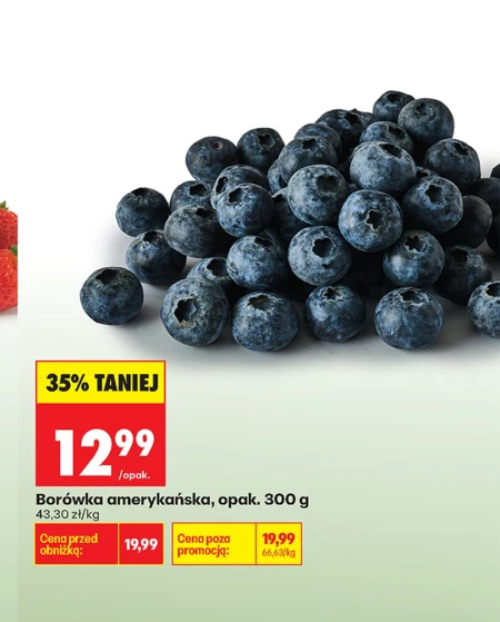 Borówka amerykańska, opak. 300 g 43,30 zł/kg Cena przed obniżką: 19,99 Cena poza promocją: 19,99 66,63/kg