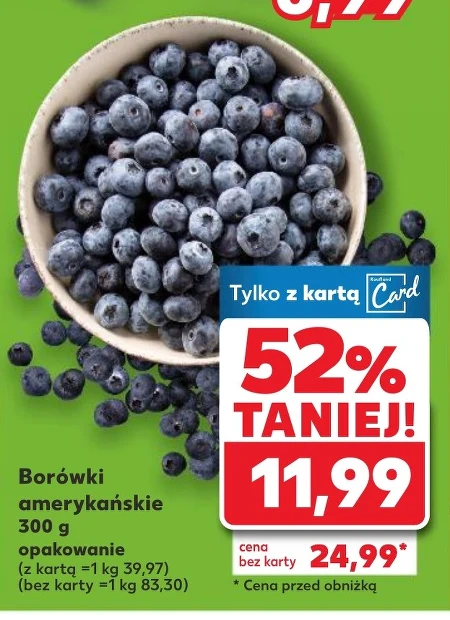 Borówki amerykańskie 300 g opakowanie (z kartą =1 kg 39,97) (bez karty =1 kg 83,30) Kaufland oferuje soczyste borówki amerykańskie w wygodnym opakowaniu 300 g. Dzięki korzystnej cenie z kartą lojalnościową, kilogram borówek można nabyć już za 39,97 zł, co czyni je idealnym wyborem na zdrowe przekąski, do deserów czy jako dodatek do śniadania. Bez karty cena pozostaje atrakcyjna, wynosząc 83,30 zł za kilogram. To doskonała okazja, by zaopatrzyć się w bogate źródło witamin i antyoksydantów.