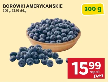 Borówki amerykańskie dostępne są w ofercie Stokrotka w cenie 15,99 zł za opakowanie 300 g, co daje 53,30 zł za kilogram. Aktualna cena promocyjna to 15,99 zł, w zwykłej ofercie kosztują 17,99 zł. Świeże borówki to doskonały dodatek do śniadań, deserów, ciast oraz zdrowa przekąska między posiłkami. Warto skorzystać z tej okazji, aby zaopatrzyć się w te wyjątkowo smaczne owoce.