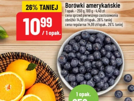 Borówki amerykańskie 1 opak. - 250 g. 100 g - 4,40 zł cena sprzed pierwszego zastosowania obniżki: 14,99 zł/opak., 26% taniej cena regularna: 14,99 zł/opak., 26% taniej